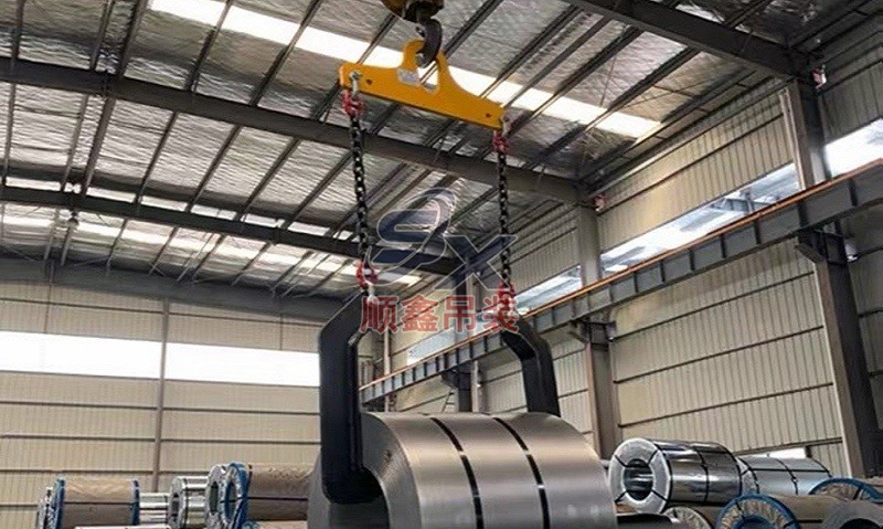 翻轉(zhuǎn)吊具通過機械剪力原理,對立式擺放的卷鋼進行單邊抓取,來完成卷鋼的裝卸,當改變重力點時,可以對卷鋼進行翻轉(zhuǎn),作業(yè)時不傷鋼卷。其吊耳采用加厚處理,焊縫飽滿牢固、延長使用壽命。